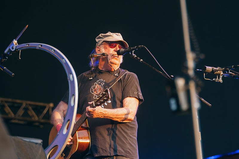 NEIL YOUNG, YUSUF/CAT STEVENS and VAN MORRISON, HYDE PARK, LONDON, 11 JULY: “What a world we’ve got, folks,” smirks Neil Young, before hurtling into an encore of his anti-war classic ‘Throw Your Hatred Down’ and ‘Rockin’ in the Free World’, stopped only by a curfew unwilling to hear its fourth outro. His set is total purism. Whilst they look like they’re coming to decorate your house, his new band the Chrome Hearts is every bit as bitingly free and pummelling as Crazy Horse. Young walks around the stage like it’s his living room – stars and stripes flapping from a silver metal boombox perched on a flight case side stage, strange stone angel in the rafters pullied down at one point to offer him a guitar, “Love Earth” backdrop at half-mast for two thirds of the night due to a technical fault that he doesn’t care to correct.